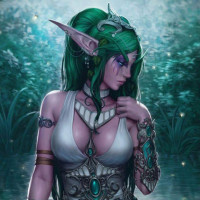 green hair and pointed ears, typical characteristics of drows. She is wearing elaborate armor and jewelry, suggesting she could be a noble or high-ranking member of her society within