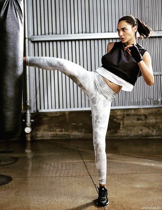 martial arts or boxing practice. She is kicking her leg upwards and appears to be in the middle of performing a kick or strike. Her pose suggests she is well-versed in the sport or activity depicted.