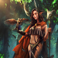 pointed ears that are characteristic of elves in fantasy media. In her hands, she holds a raven and an owl, which could suggest that she has