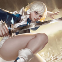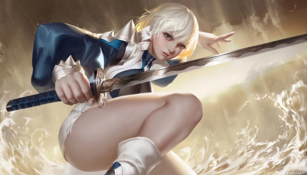 blonde hair, wielding a sword and sitting in a dynamic pose. She is wearing what looks like a fantasy-style outfit with