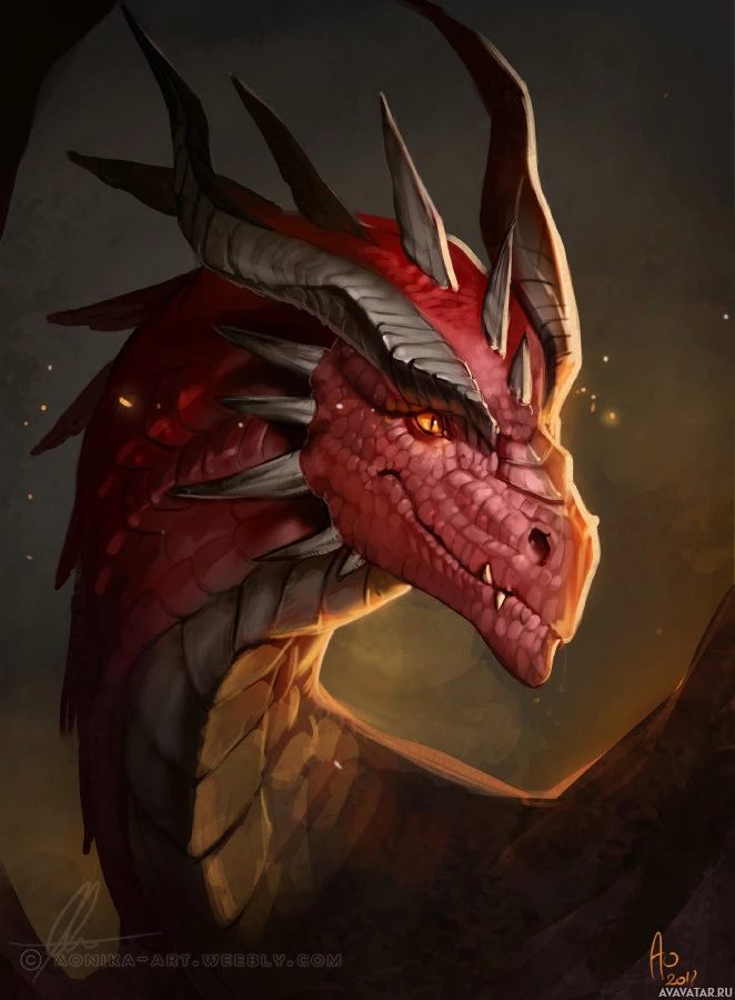 sharp teeth, and a pair of horns on its head. The dragon is depicted in profile, showing one side of its face which includes an eye, nose, mouth, and whiskers. The background suggests a dimly lit or possibly magical setting, enhancing