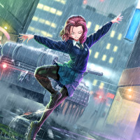 На картинке изображен анимированный персонаж, молодая женщина с розовыми волосами. Она носит школьную форму и, кажется, танцует или выступает под дождем. Ее поза предполагает движение, и она, кажется, наслаждается собой, несмотря на влажные погодные условия вокруг нее. Обстановка включает уличные фонари, неоновые вывески, и это, кажется, городская ночная сцена под дождем.
