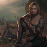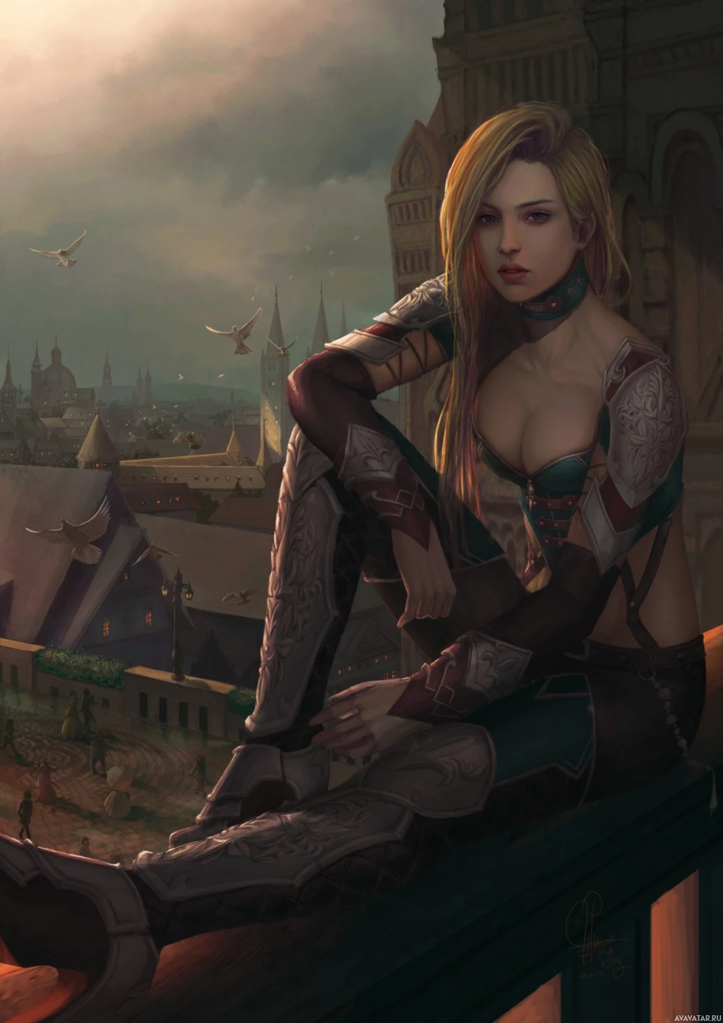 a female character, who appears to be an archer or warrior, based on her attire and gear. She is sitting on what looks like the edge of a rooftop or battlement, overlooking a cityscape with buildings and flying creatures that might be interpreted as birds or