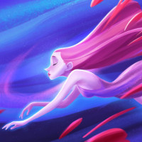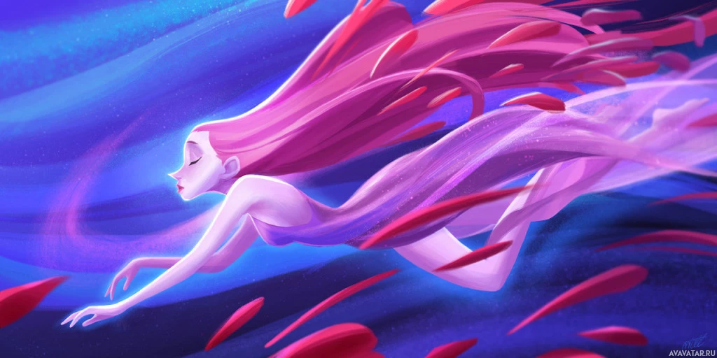 pink hair who appears to be flying or moving swiftly through the air. Her eyes are closed, and she has