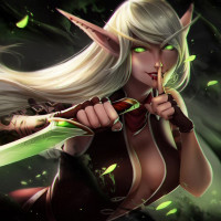 blonde hair and is wearing a dark-colored outfit with red accents. In her right hand, she holds a sword that appears to be magically enhanced or glowing. Her left hand is raised as if casting a spell, and her expression is one of concentration or power. The background features ominous green and black color tones, which could suggest a dark or