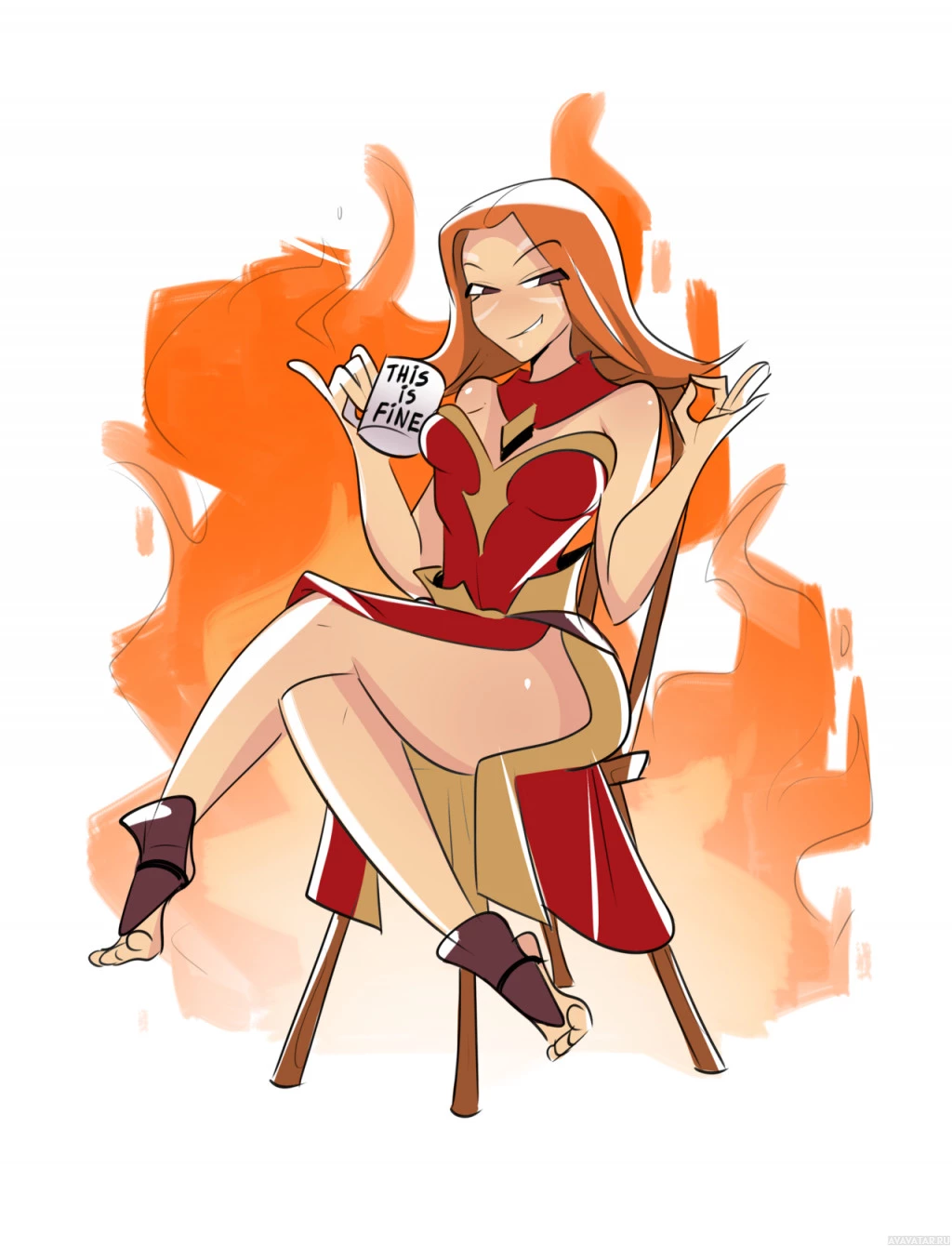 a female character sitting on a chair with her legs crossed. She is wearing a red and gold outfit, which resembles the attire of the Dota 2