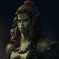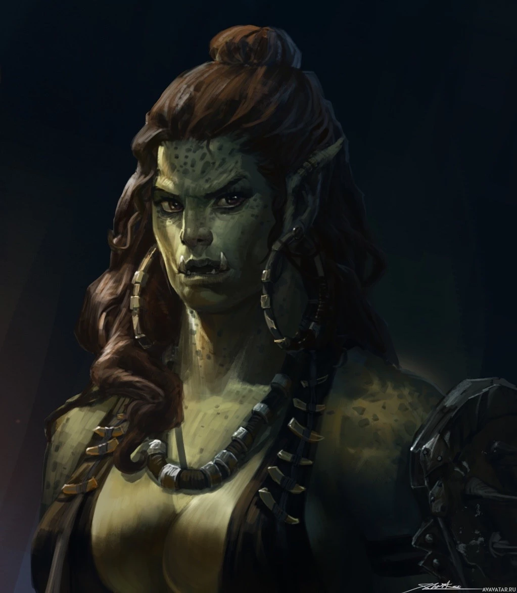 green skin, which is also common for orcs, and intricate tattoos that suggest it might be part of a warrior culture. The character is wearing armor and adornments, indicating its status as a warrior. The artwork showcases the creativity and attention to detail often found in fantasy illustrations.