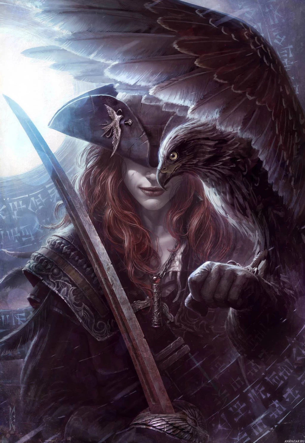 red hair and is wearing a costume that includes a tricorne hat, a black jacket with gold accents, and pants. In her left hand, she's holding what looks like a sword or knife, while in her right hand, she's holding an eagle or bird of prey on her arm. The character is also wearing a pair of goggles, which adds to her