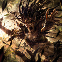 dark hair and what appears to be a battle cry or intense expression on her face. She is adorned with various armor pieces that give the impression of being part of a warrior or combatant class in this