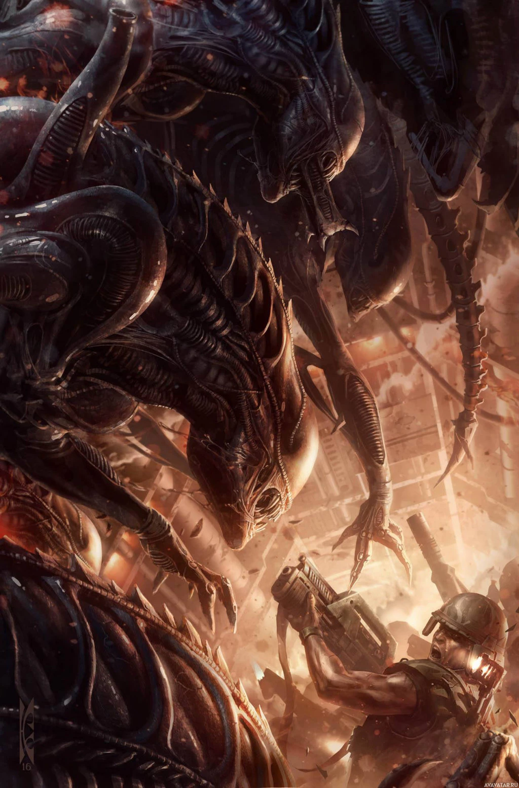 The image depicts a dramatic and action-packed scene featuring characters that resemble those from the "Aliens"