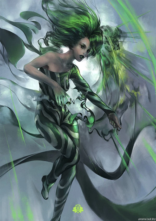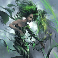 shades of green and black. The background suggests an ethereal or mystical setting with swirling patterns and possibly energy or