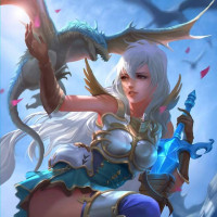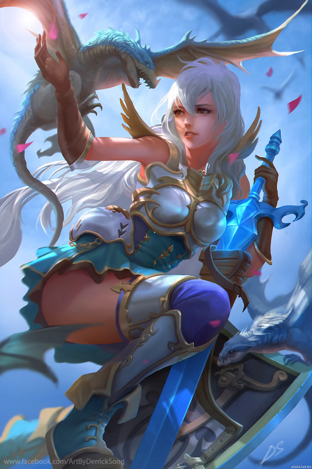 a fantasy character, specifically a girl with blonde hair. She is dressed in armor and holds the reins of a dragon-like creature. The setting appears to be a sky or heavens, as suggested by the presence of clouds and what seems like stylized