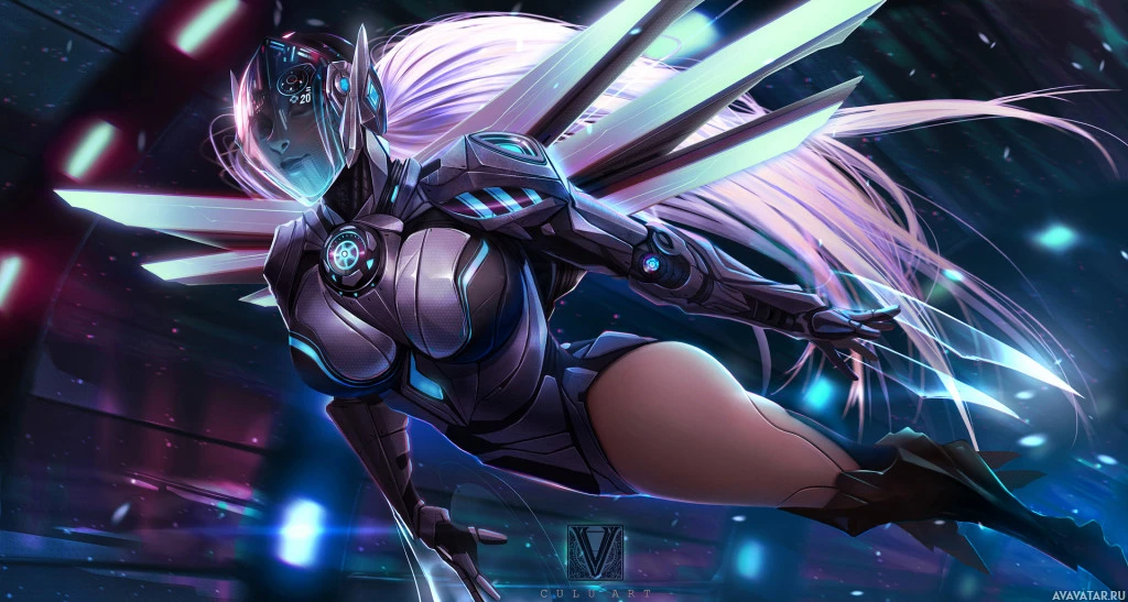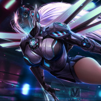 streaks of light that could imply motion or the use of technology. The overall aesthetic is vibrant and detailed, highlighting the character's design and suggesting she is part of an advanced civilization or a universe where such characters exist.