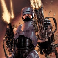 a fictional character who appears to be a cyborg police officer. In the image, RoboCop is depicted in his signature