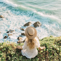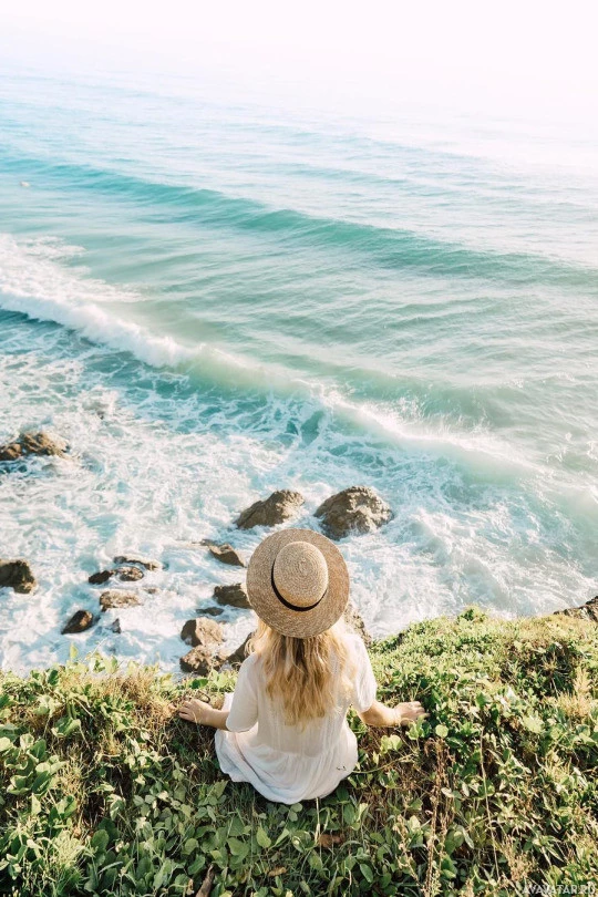 the edge of a coastline, overlooking the ocean. The individual appears to be female with long