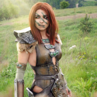 the video game "The Elder Scrolls" named Aela the Huntress. They are wearing a detailed armor set with visible breastplate and shoulder guards, and their hair is styled to match the character's appearance, complete with