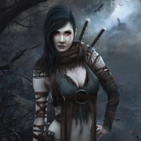 a female character standing in what appears to be a dark, forest-like environment. She has