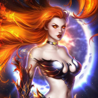 red hair, dressed in a fantasy-inspired armor that has flames or fire elements incorporated into its design. She is holding a staff or rod adorned with what appears to be crystals, and her posture suggests she might be engaged in some form of magical or combat activity. The background consists of swirling energy or particles, enhancing