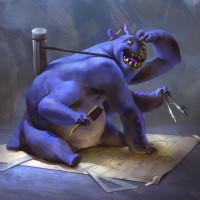 round body and is sitting down with its legs stretched out in front of it. The creature has an expression that could be interpreted as surprised or shocked, and it's holding a pair of scissors in its hands. On the floor in front of the creature, there appears to be some kind of design or drawing material, suggesting that the monster might be involved in some sort of artistic or creative activity. The style of the image is reminiscent of digital illustration or