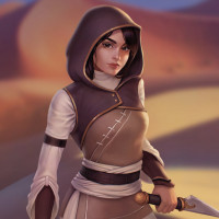 a young woman with brown hair, wearing historical-style clothing and accessories that suggest she might be part of an adventure or action storyline. She is holding what seems to be a sword in one hand and has the hood up on her head, which adds