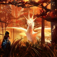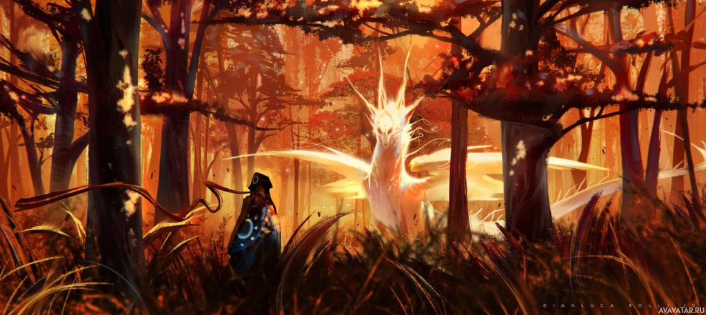 warm hues dominating the scene, which suggests it might be either dawn or dusk. The character appears to be facing the creature, and they seem to be in some