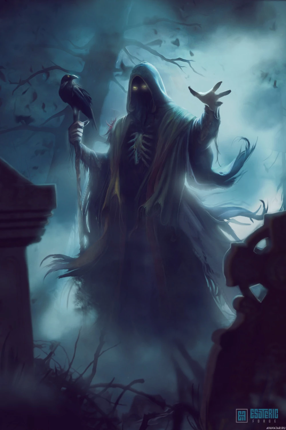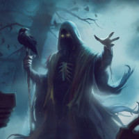The image depicts a figure that appears to be from a fantasy setting. This character is hooded and cloaked, giving an impression of mystery or mysticism. They are holding out their hands as if casting spells or performing magic. The backdrop suggests a graveyard or a haunted location with mist and the silhouettes of trees, adding to the eerie atmosphere of the scene.
