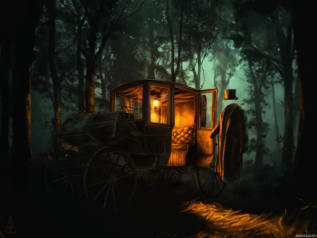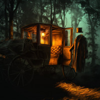 the 19th century, which suggests a historical or fantasy theme. The overall mood of the picture is mysterious and somewhat eerie, fitting the description of "fantasy" and "ghost," while the forest setting complements these elements.