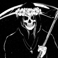 The image features an illustration of a character who appears to be Death, often associated with the Grim