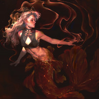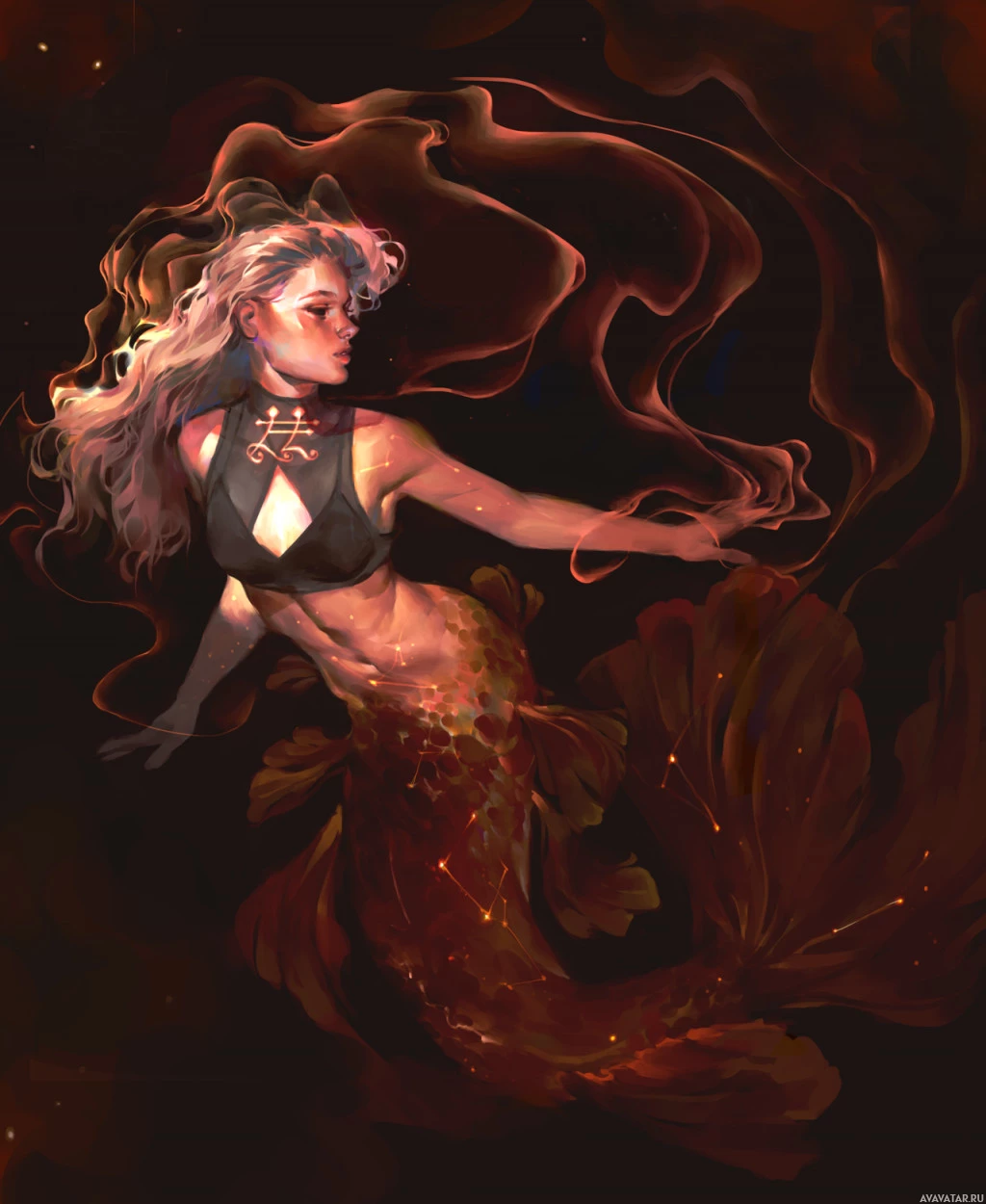 an artistic rendition of a mermaid. She is portrayed with human-like characteristics, standing upright on her tail, and appears to be dancing or performing