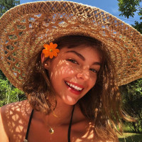 The picture features a young woman wearing a large straw hat and smiling. She has short hair and is holding a flower, possibly an orange hibiscus blossom, in her teeth. Her facial expression suggests she is happy or enjoying herself.