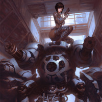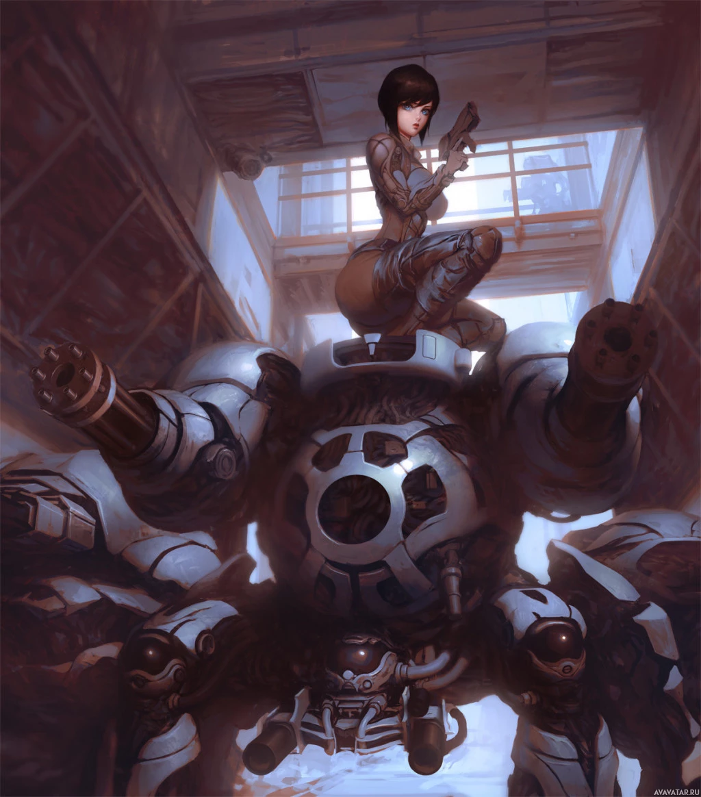 brunette hair, sitting on top of a robot. The robot appears to be of a humanoid design and is quite detailed, suggesting