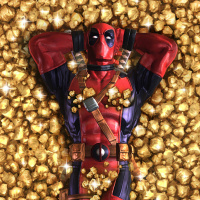 gold coins. The character is also wearing a costume typically associated with the character Deadpool, which includes red and black colors,