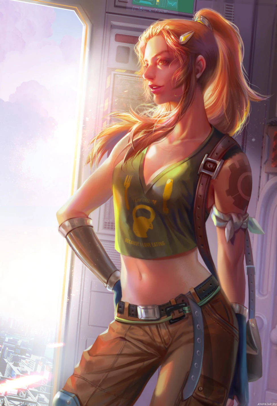 На картинке изображена женщина с рыжими волосами, одетая в футуристическую одежду, напоминающую военную форму. Она стоит в том, что кажется интерьером космического корабля или подобной обстановке. Ее поза предполагает уверенность и готовность, что может означать, что она является членом какого-то специализированного подразделения или группы. Фон намекает на тему научной фантастики.