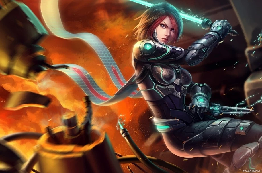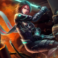 red hair. She is wearing a suit of armor, which suggests she might be in a combat situation or