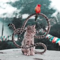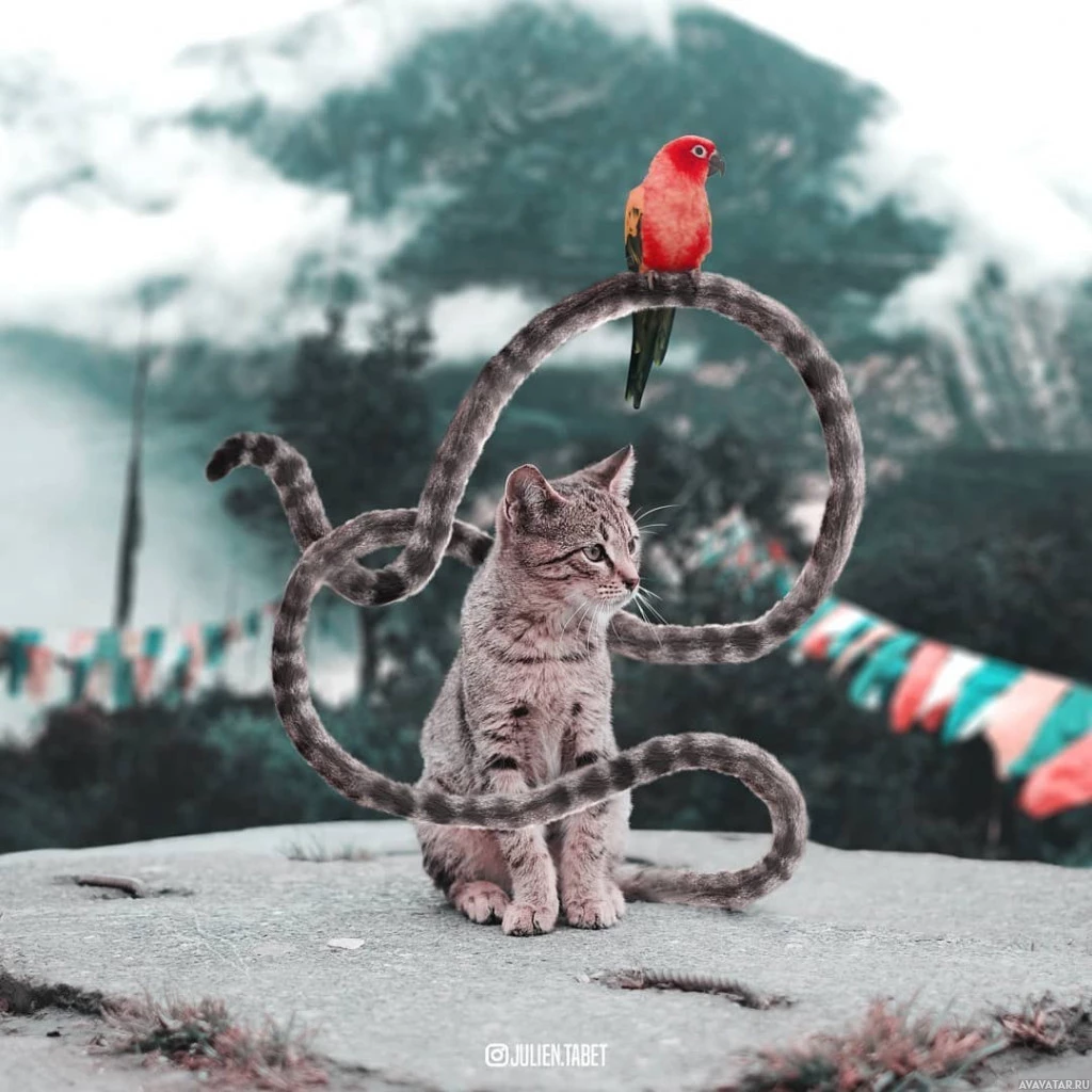 The image depicts a cat sitting on the ground with its tail wrapped around the handle of a long-handled tool, which appears to be a shovel or similar implement. Above the cat and its tail, there is a bird perched, seemingly looking down at the cat. This setup creates an amusing
