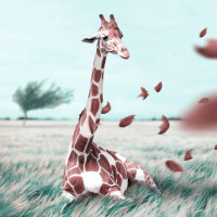 a clear sky with clouds, and there are some tree leaves that have fallen to the ground near the giraffe. The overall impression is serene, and the colors are soft and pastel-like, suggesting it might be an edited or digitally enhanced image rather than a photograph of