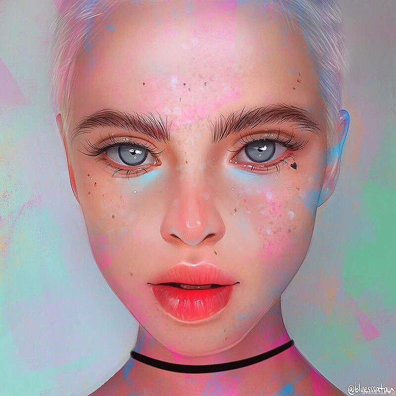 an edgy look, and she wears a black choker around her neck. The background is colorful with splashes of pink, blue, and other colors that seem to blend together in a somewhat
