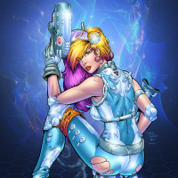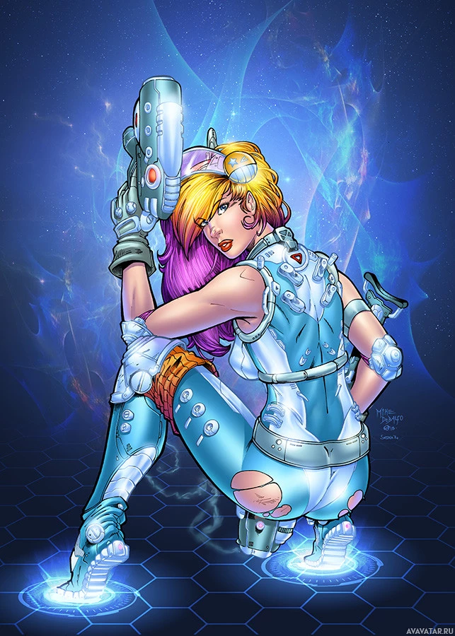 blonde hair styled in a manner consistent with her futuristic theme. The background features neon colors and