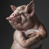 The image features a stylized depiction of a pig that has been altered to include human-like attributes. It is standing upright and appears to be wearing clothing, with one hand on its hip and the other holding what seems like