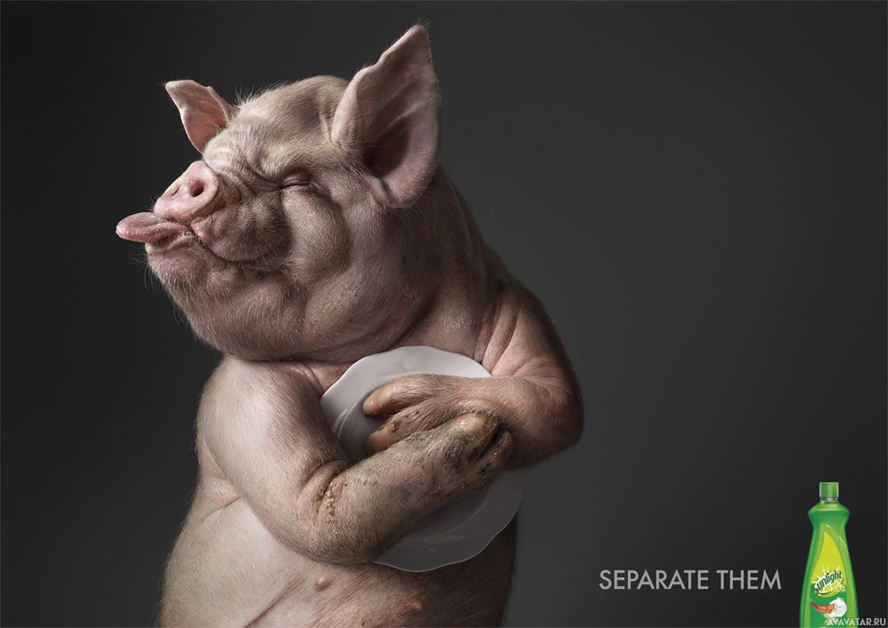 the pinkish hue of the pig's skin. On the right side of the image, there is a bottle of