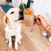 На снимке есть лабрадор-ретривер, сидящий на полу в помещении. Рука человека держит стеклянную банку, содержащую то, что кажется белковым коктейлем или смузи с различными красочными ингредиентами внизу. Собака, кажется, нюхает или дегустирует банку, что указывает на любопытство к содержимому банки.