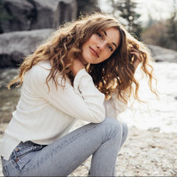 a young woman sitting on the ground by what appears to be a creek or river. She has