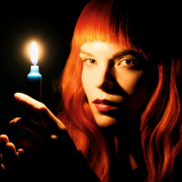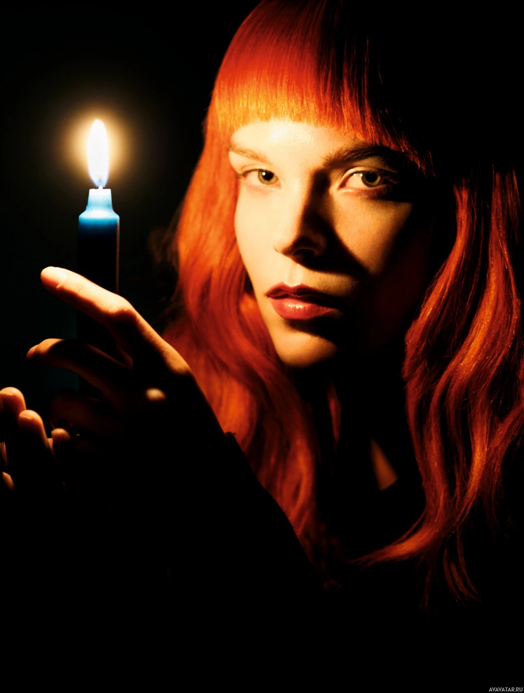 red hair holding a lit candle. She appears to be in a dimly lit environment, possibly