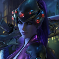 the video game "Overwatch." This character is Widowmaker, identifiable by her iconic purple and black suit, which includes a visor with two