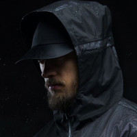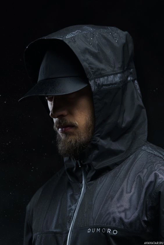 На снимке изображен мужчина в черном плаще с капюшоном. У него борода, и он смотрит в сторону с нейтральным выражением лица. Шерсть, по-видимому, сделана из водонепроницаемой ткани, подходящей для влажных условий, что согласуется с ее использованием в качестве плаща.