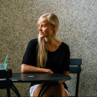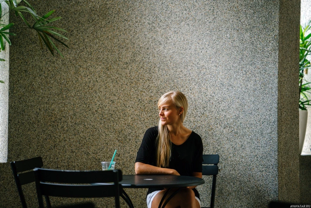 a cup on the table, suggesting that she might have been enjoying a drink, and there are chairs around the table indicating it could be a dining setting. The background features tiled walls, which is common in many cafes for their aesthetic appeal, and there's