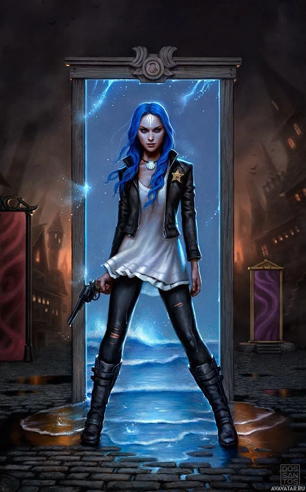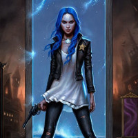 blue hair, dressed in what appears to be a steampunk or gothic outfit, including a leather jacket, bustier, and pants. They are also wearing