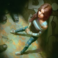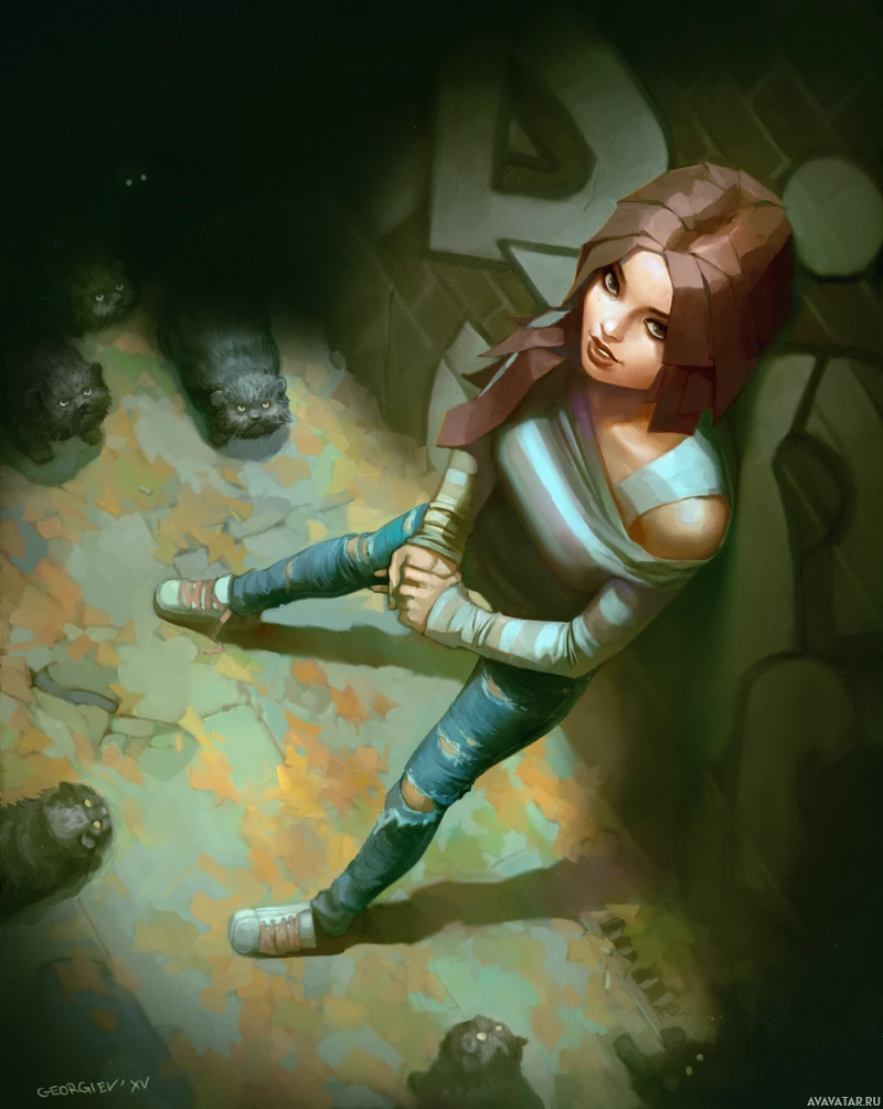an urban environment with graffiti on the walls in the background. The artwork has a moody and somewhat surreal atmosphere, combining elements of realism with fantasy.