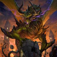sharp teeth, horns, and is surrounded by a dark and ominous atmosphere, which suggests the setting could be related to fantasy or horror genres. In the background, there appears to be a castle or ruins on fire, indicating