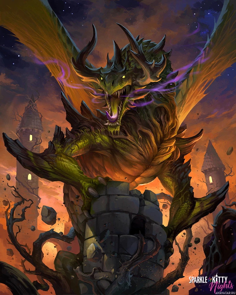 The image shows a fantasy-themed illustration featuring a creature that resembles a dragon. The dragon has